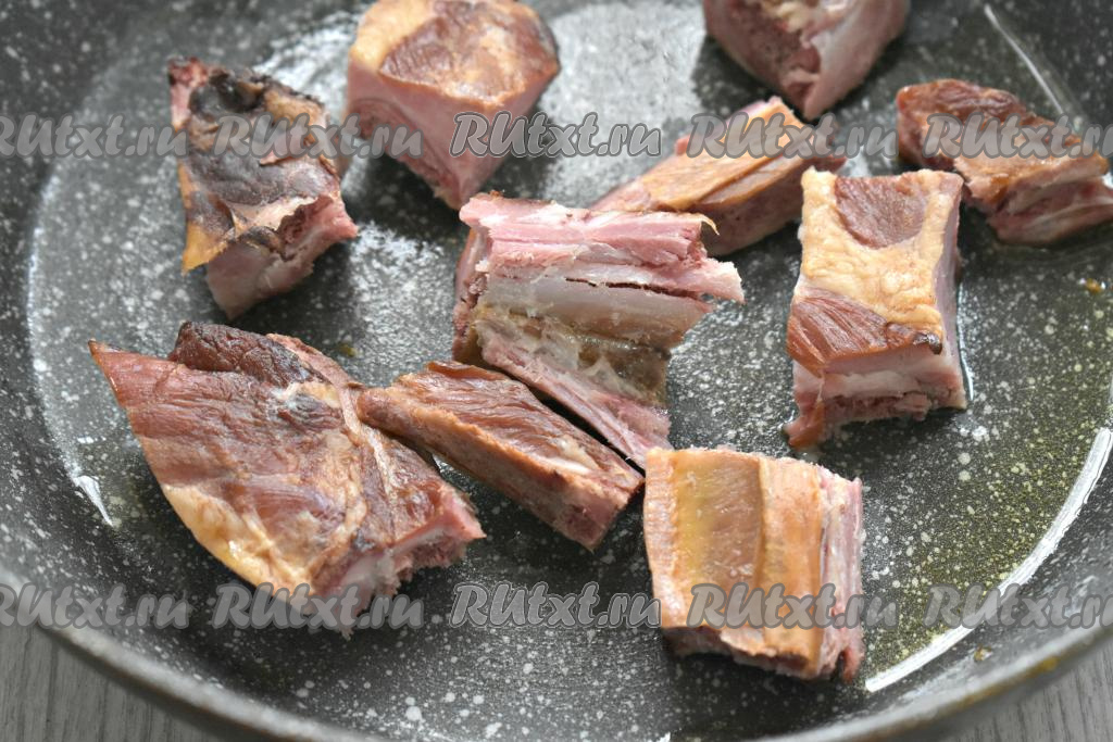 Копчёные рёбрышки разрубаем на небольшие кусочки. При желании рёбра можно обжарить на сковороде, на которой готовились овощи, в течение 3 минут (до подрумянивания мяса со всех сторон).