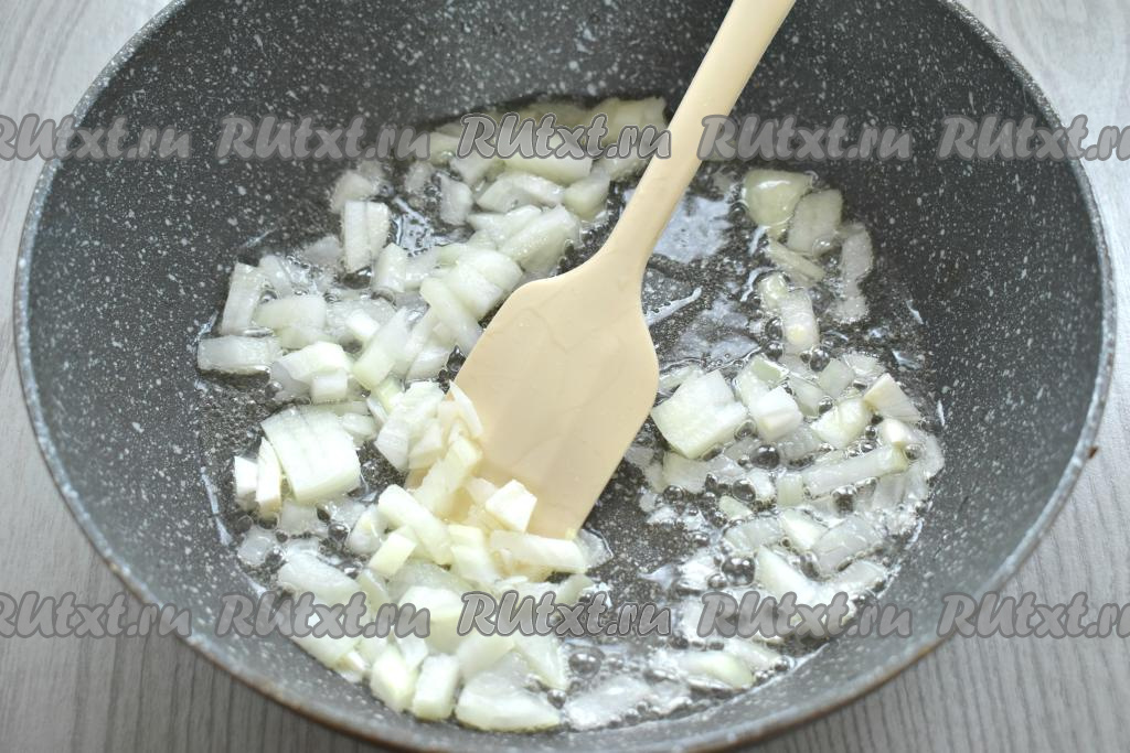 Лук и морковь очищаем. В сковороду, в которой жарился картофель, выкладываем достаточно мелко нарезанный лук, обжариваем на среднем огне, иногда помешивая, минуты 3 (до мягкости лука).