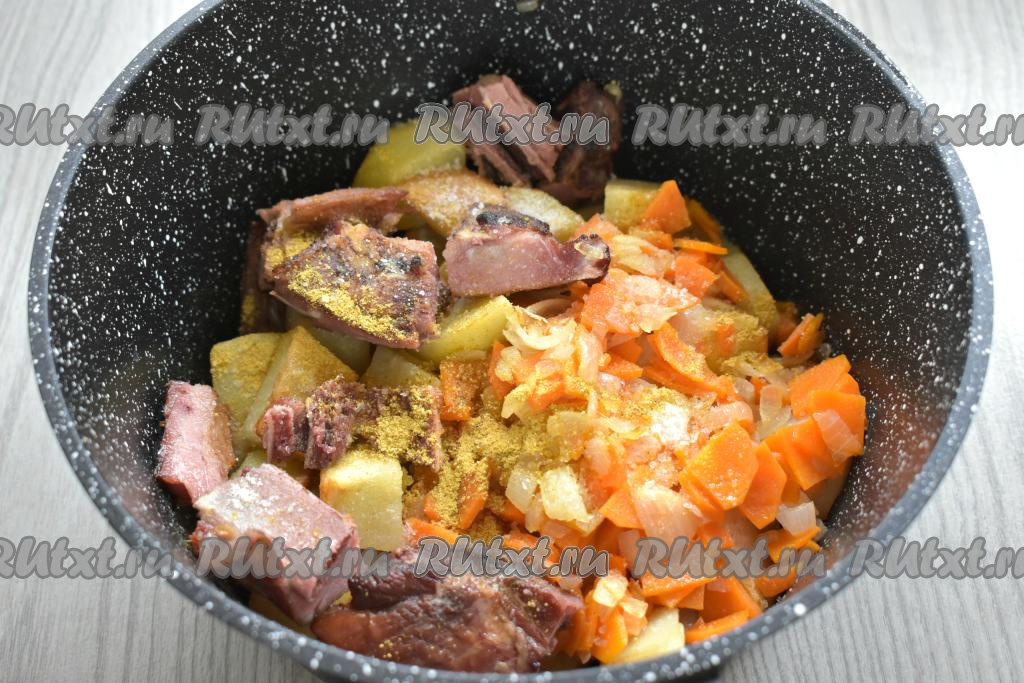 Рёбрышки со сковороды перекладываем в кастрюлю с картошкой, морковкой и луком, ставим на средний огонь, по вкусу солим, сдабриваем специями (в качестве специй я добавила 1 чайную ложу готовой приправы для картофеля), перемешиваем.