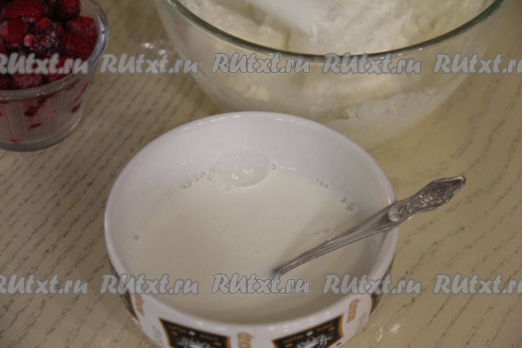 Затем прогреть молочно-желатиновую смесь до полного растворения кристаллов желатина на среднем огне, постоянно помешивая и не доводя до кипения. Можно прогреть молочно-желатиновую смесь и в микроволновке до полного растворения кристалликов желатина, главное - не дать закипеть. В творожную массу постепенно добавить молочно-желатиновую массу, при этом постоянно пробивая блендером. Творожно-желатиновая масса должна получиться однородной и негустой.