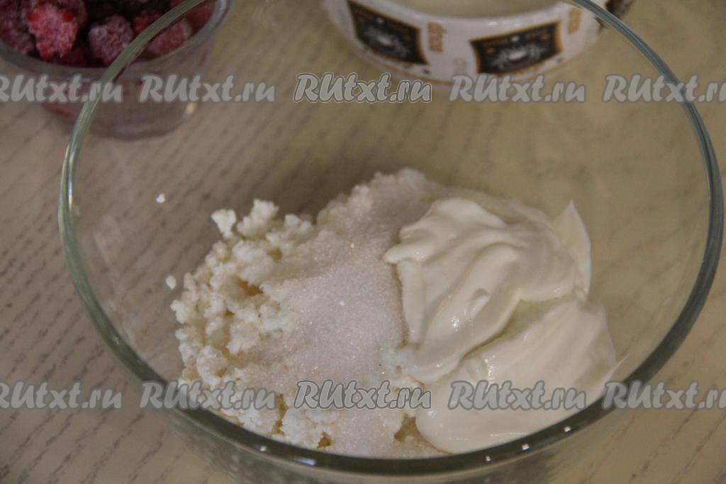 В миске соединить творог, сметану и сахар.