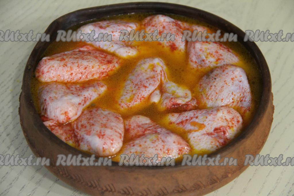 Куриные крылышки посолить по вкусу, добавить любимые специи (у меня - карри и молотая паприка), тщательно перемешать.