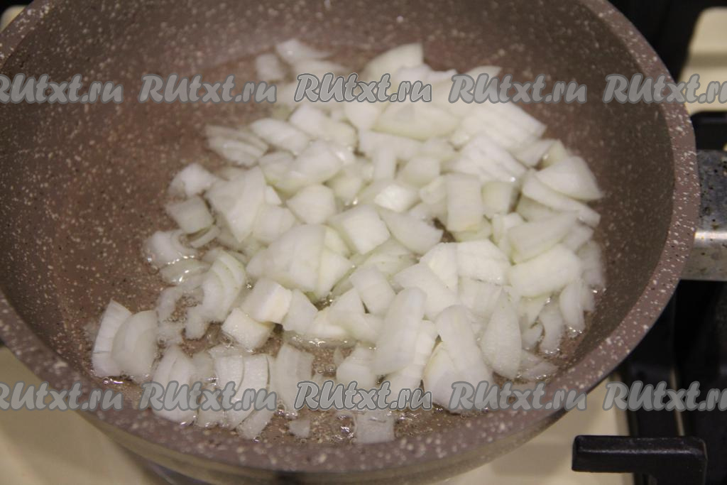 Влить в сковороду растительное масло, дать ему хорошо разогреться на достаточно сильном огне, уменьшить огонь до среднего, выложить мелко нарезанный лук и обжарить его, иногда помешивая, в течение 4-5 минут (до прозрачности лука).