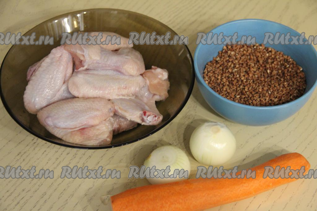 Подготовить продукты. Лук и морковь почистить. Куриные крылышки промыть водой, отрезать крайнюю фалангу (в крайних фалангах крыльев практически нет мяса). Гречку, если нужно, перебрать, выложить в сито, тщательно промыть под проточной водой, оставить на несколько минут, чтобы стекла лишняя вода.