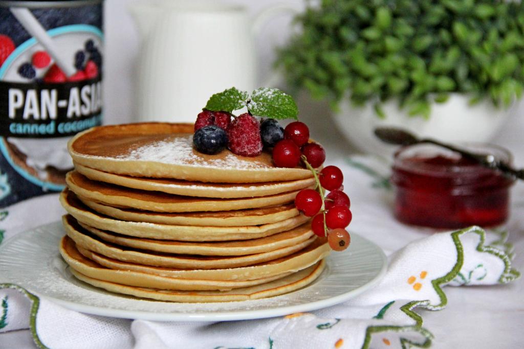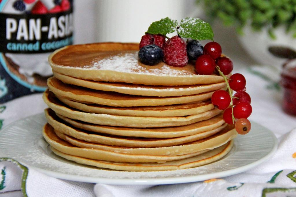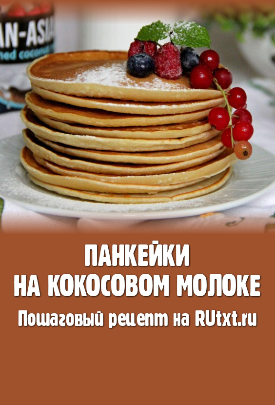 Аппетитные, нежные панкейки, замешанные на кокосовом молоке, к столу подать, дополнив вареньем, мёдом или растопленным сливочным маслом.
