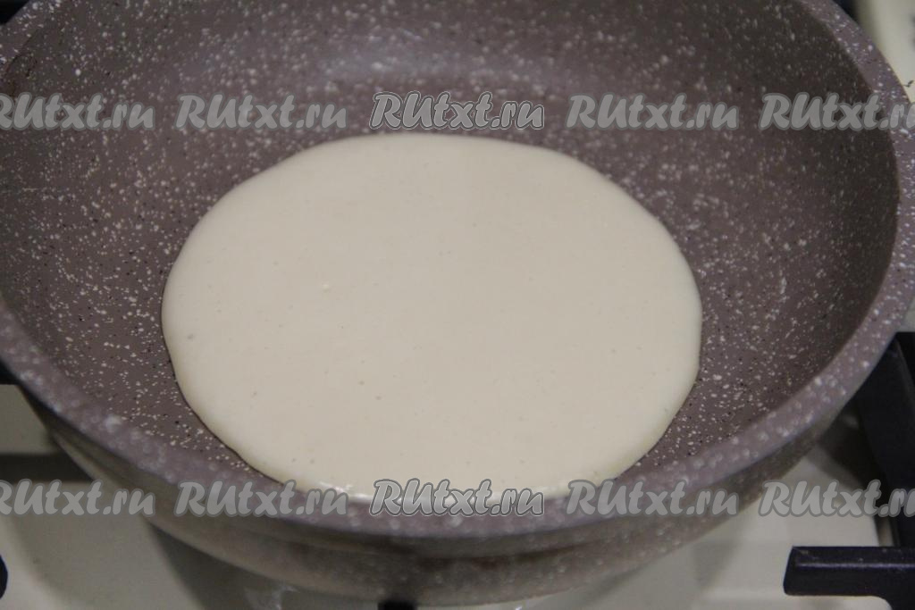 Сковороду хорошо разогреть. Панкейки принято выпекать на сковороде, не смазанной растительным маслом. Но всё же лучше ориентироваться на качество сковороды, на которой вы готовите. Поэтому, если будет необходимость, слегка смажьте сковородку маслом перед жаркой первого блинчика. Я сковородку ни перед жаркой первого, ни перед жаркой последующих панкейков маслом не смазывала. В центр разогретой сковороды влить небольшой половник теста, уменьшить огонь до среднего. Получается панкейк диаметром примерно 12 сантиметров.