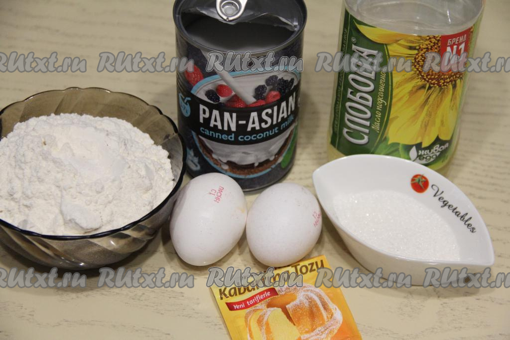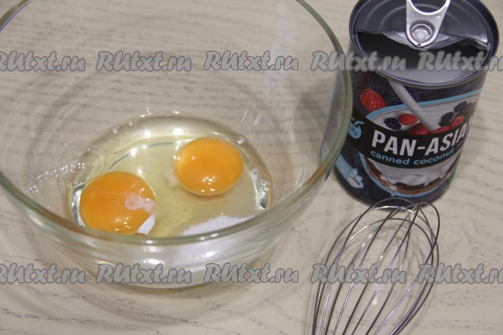 В однородную яичную смесь влить кокосовое молоко.