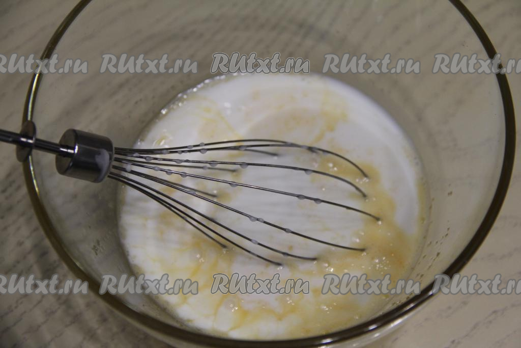 Сразу же добавить растительное масло, перемешать венчиком до однородности.