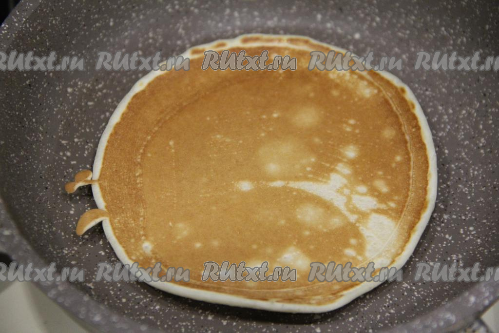 Жарить кокосовый панкейк с двух сторон до золотистого цвета. Готовый панкейк переложить на тарелку. Периодически перемешивая тесто, постепенно пожарить все панкейки (у меня всего получилось 10 панкейков).