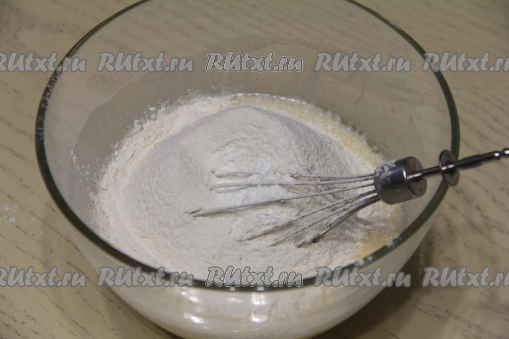 Добавить половину просеянной муки и разрыхлитель, перемешать венчиком до однородности.