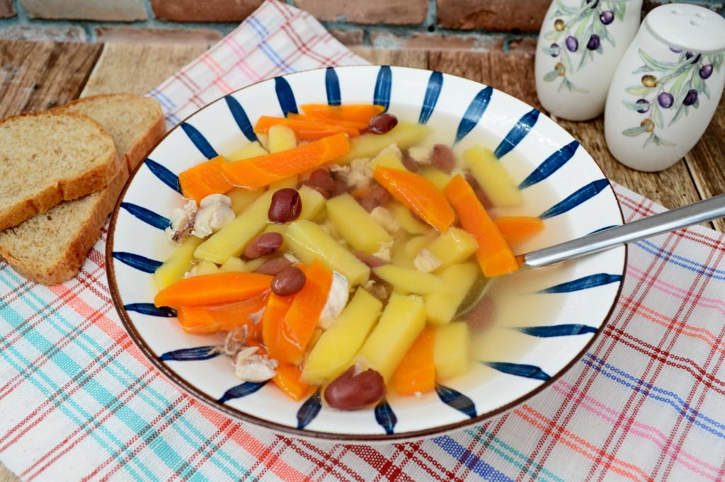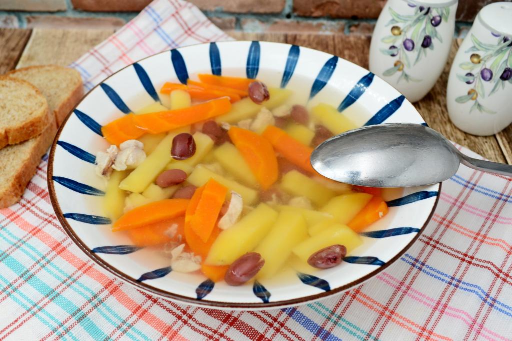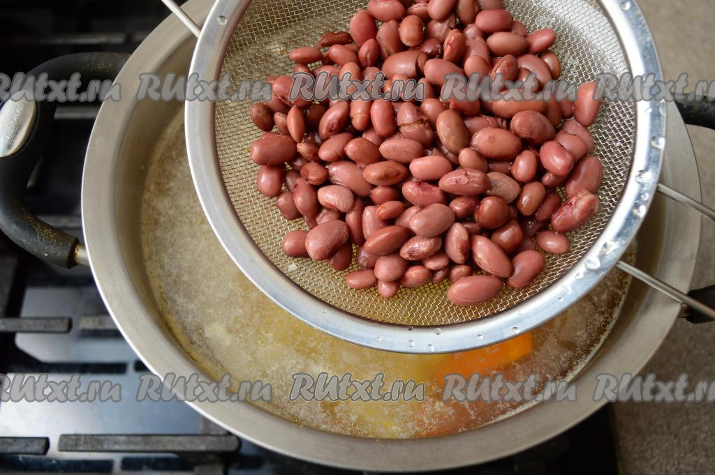 Открыть банку с красной консервированной фасолью. Откинуть фасоль на дуршлаг, по желанию, промыть под проточной водой, дать стечь лишней воде. Когда морковка и картошка станут достаточно мягкими, добавить в куриный суп фасоль, дать закипеть, проварить на небольшом огне 5 минут. Затем посолить, проварить 2 минуты и убрать с огня.