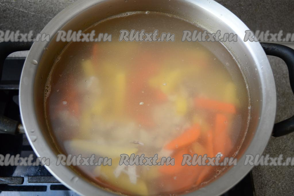 В закипевший куриный бульон выложить морковку, картошку и мясо. Снова дать бульону закипеть и варить 15 минут на небольшом огне.