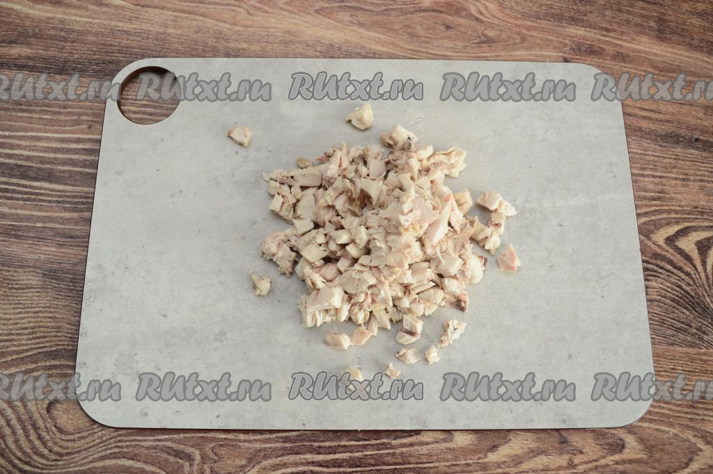 Достать варёное куриное мясо из бульона, дать немного остыть, а затем отделить от костей и нарезать на небольшие части. Бульон процедить и вернуть в кастрюлю, поставить на огонь.