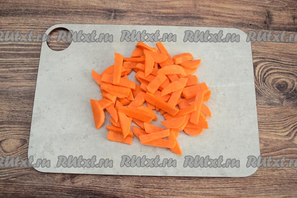 Очищенную морковку тоже нарезать на средние брусочки.
