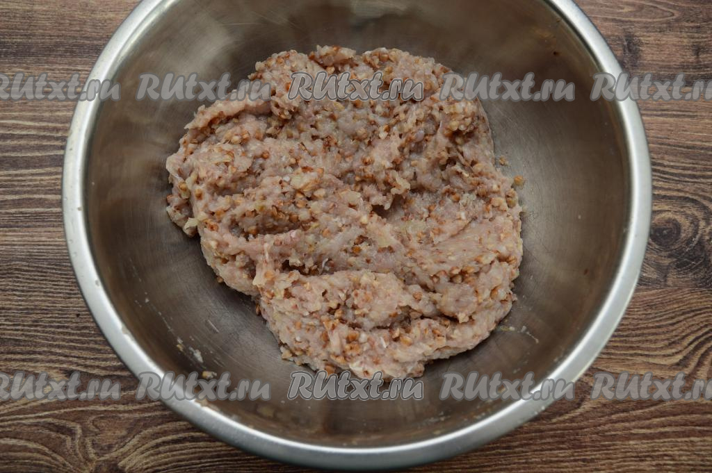 Куриное мясо вместе с очищенным луком пропустить через мясорубку, добавить остывшую гречку.