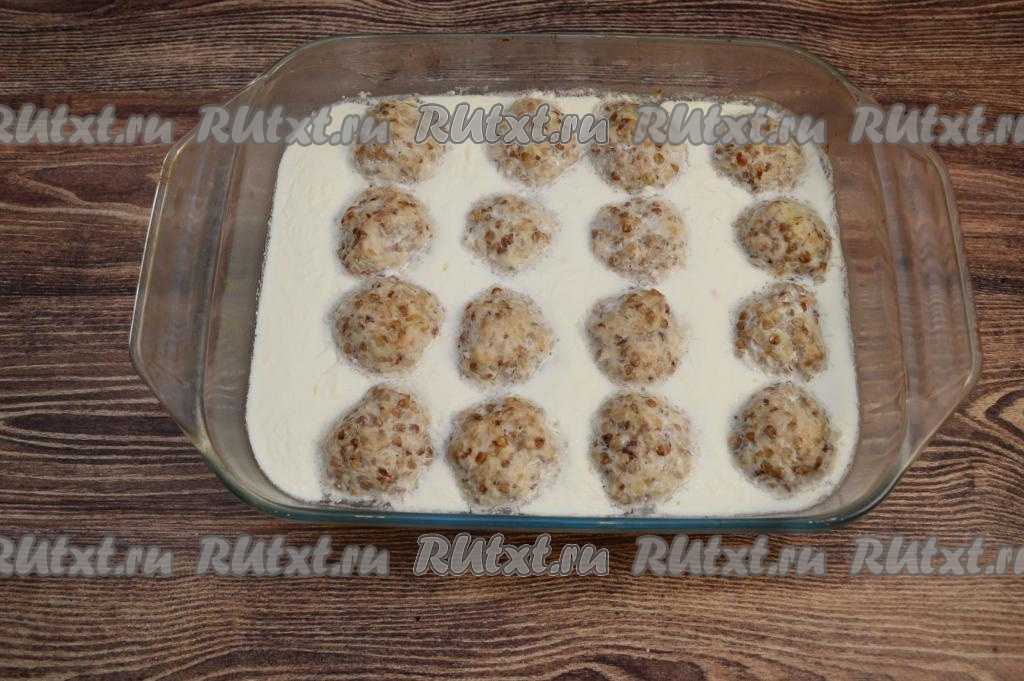 Влить получившийся сметанный соус в форму с гречаниками. Выливая соус в форму, я стараюсь, чтобы соус попал и на гречаники.