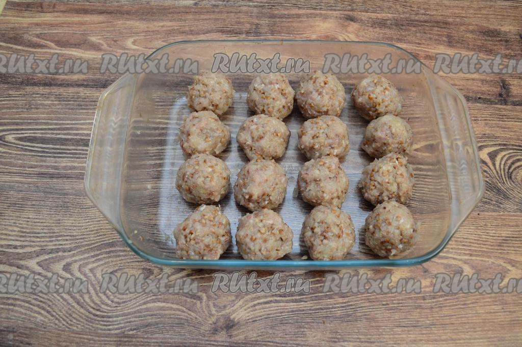Влажными руками из фарша сформировать круглые гречаники размером чуть больше, чем с грецкий орех (у меня получились 16 штук). Выложить гречаники в форму для запекания.