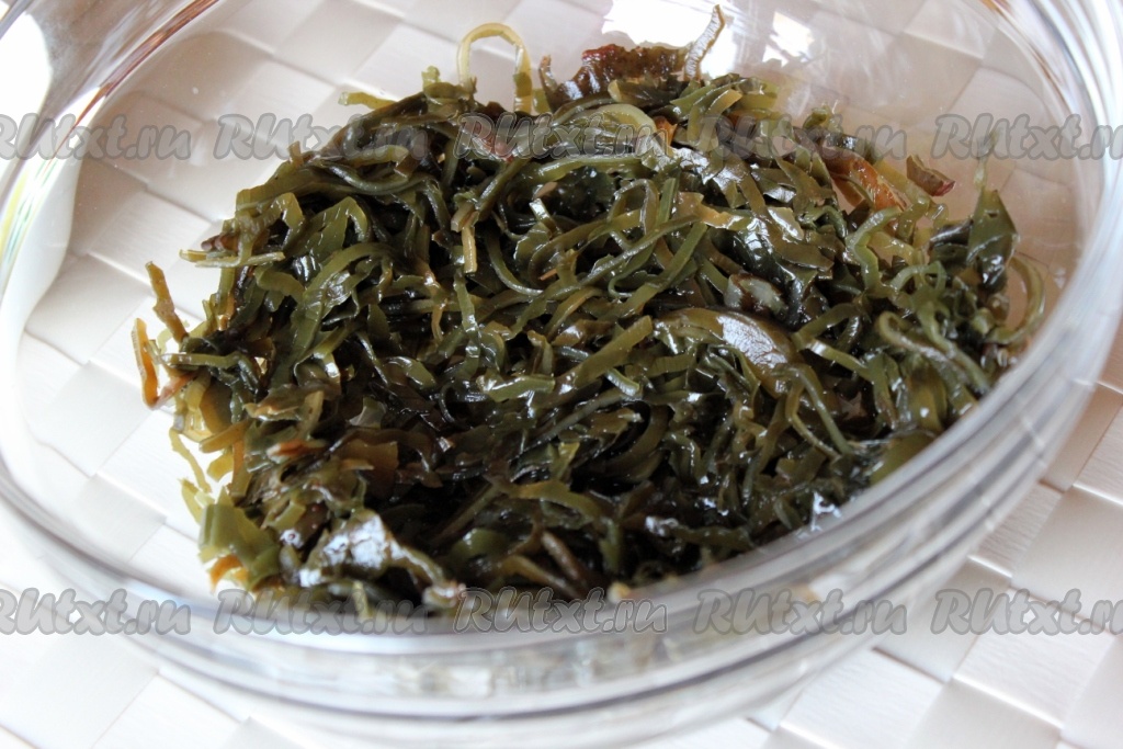 Из банки с морской капустой слить лишнюю жидкость и положить морскую капусту в салатник.