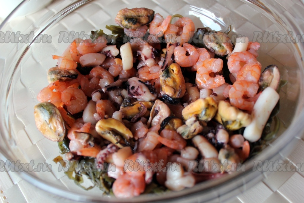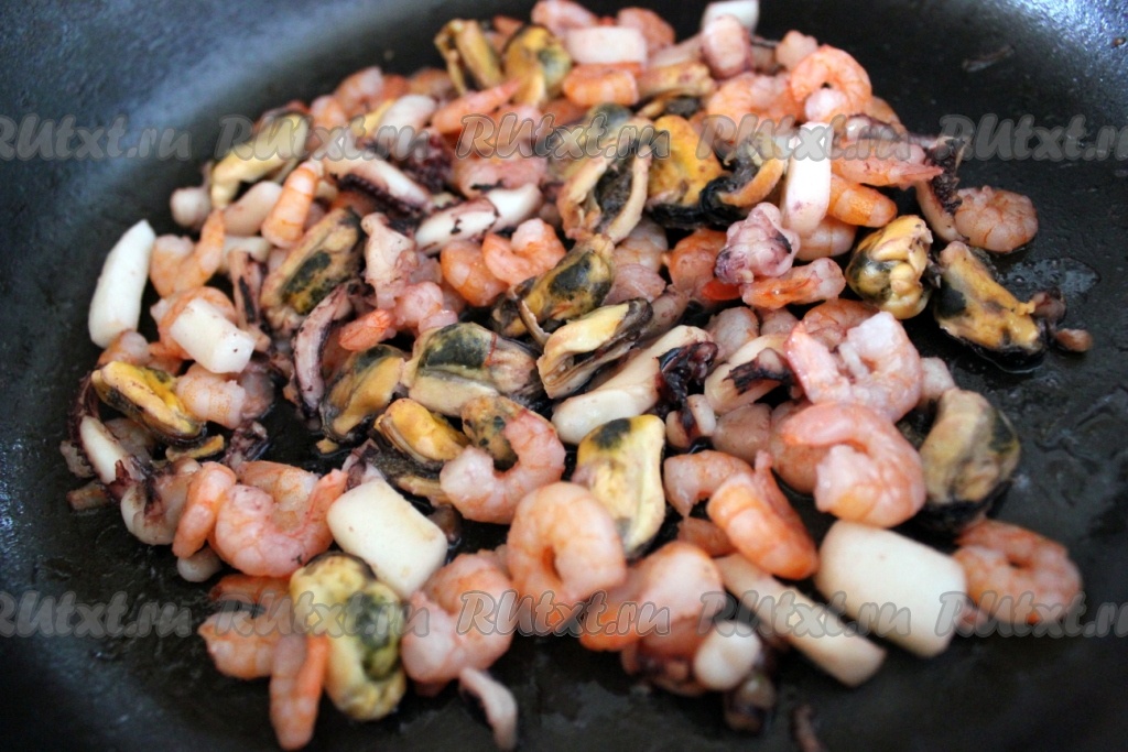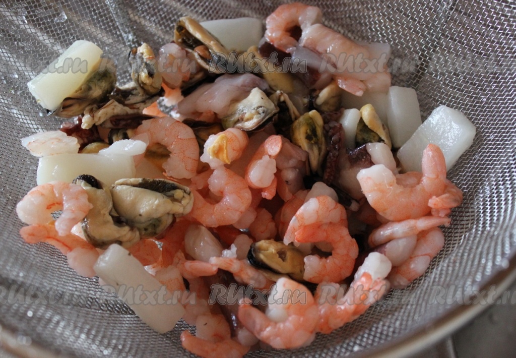Замороженные морепродукты ополоснуть горячей водой, чтобы убрать с них ледяную глазурь.