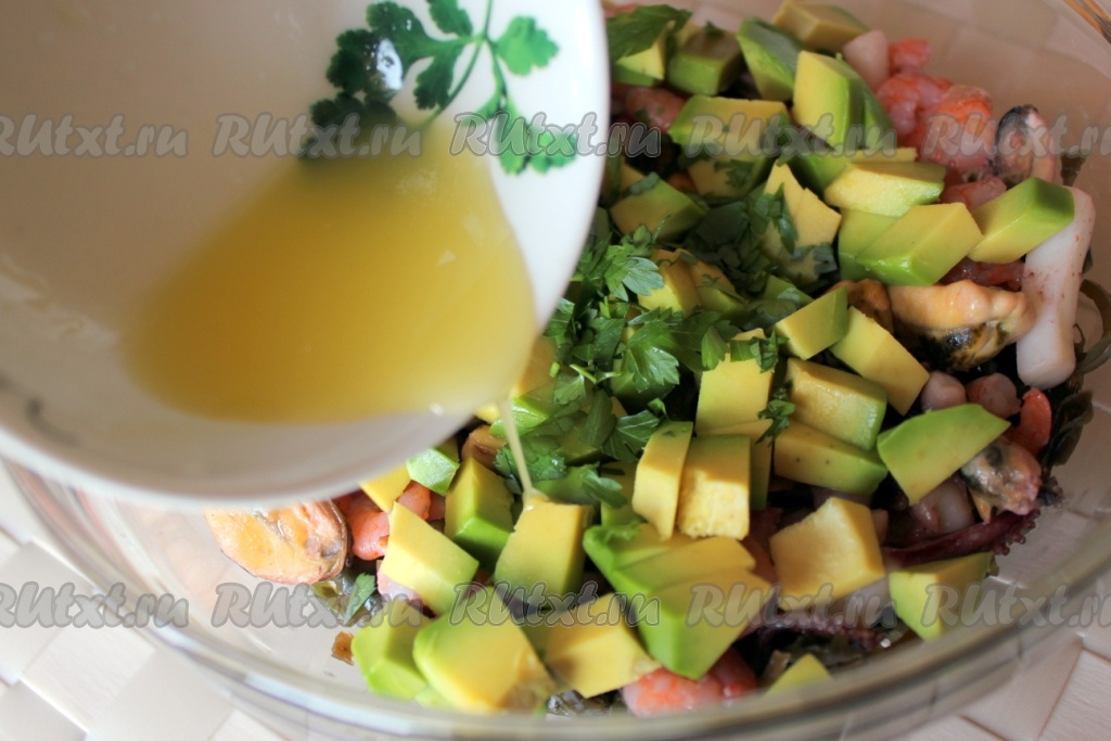 Морепродукты немного остудить и тоже положить в салатник.