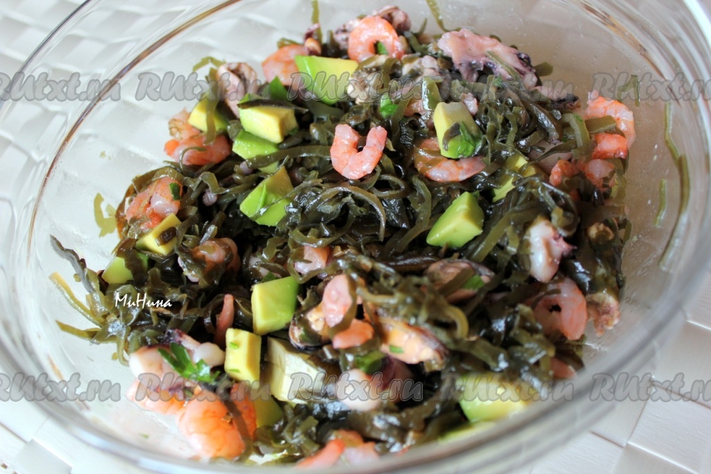 Салат из морепродуктов и морской капусты готов.