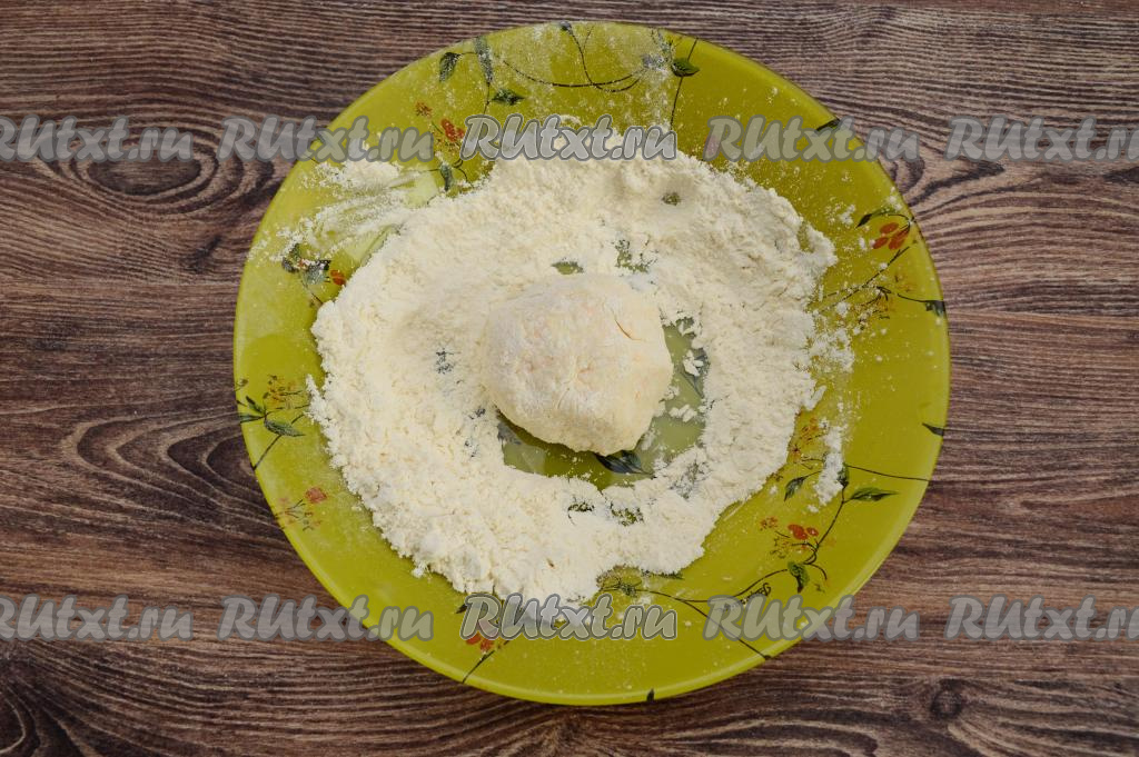 Получившееся тесто для сырников зрительно разделить на 9 равных частей (именно столько сырников с яблоками и тыквой мы и будем формировать). На тарелку насыпать 2 столовых ложки муки. Руками, слегка смоченными водой, из каждой части творожного теста сформировать круглый сырник, сразу выложить его на тарелку с мукой и обвалять со всех сторон в муке.