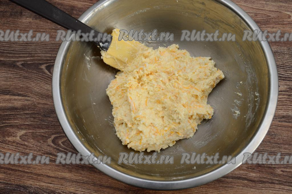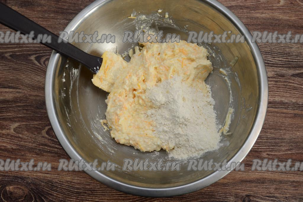 Вмешать яблоко и тыкву в творожную массу. Затем всыпать в миску 40 грамм муки.