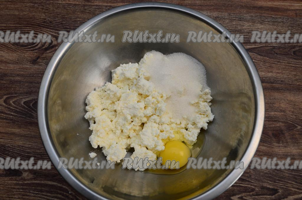 В глубокую миску выложить творог, яйцо и сахар.