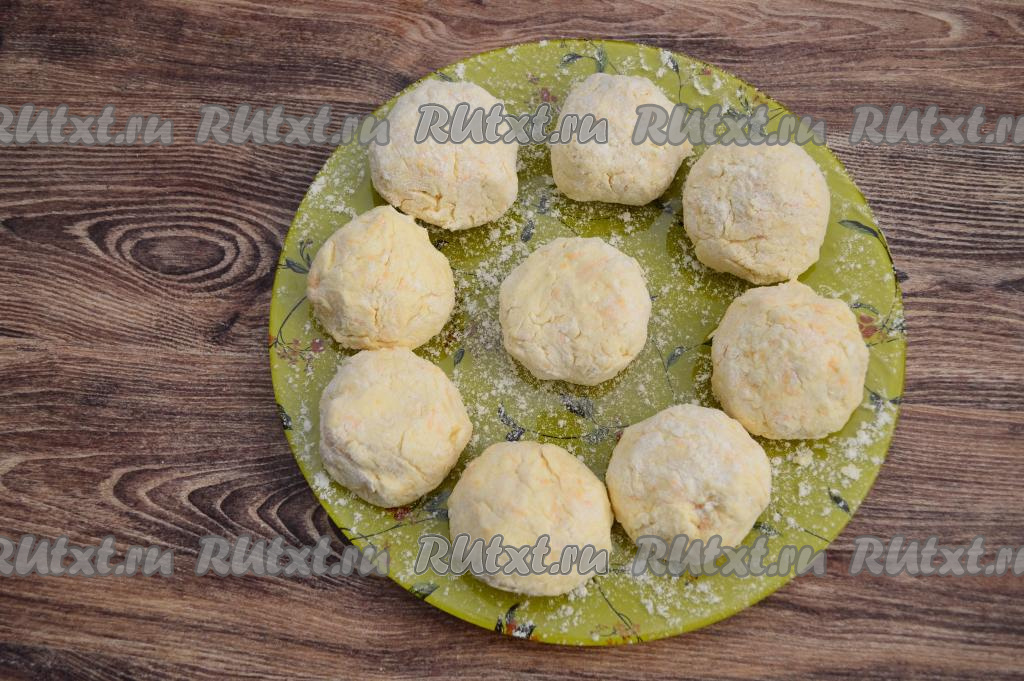 Аналогично сформировать все 9 заготовок сырников с яблоком и тыквой, разместить их на тарелке, припылённой мукой.