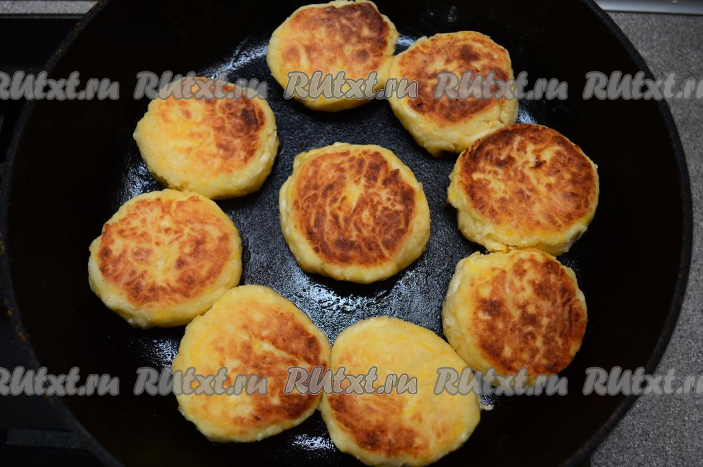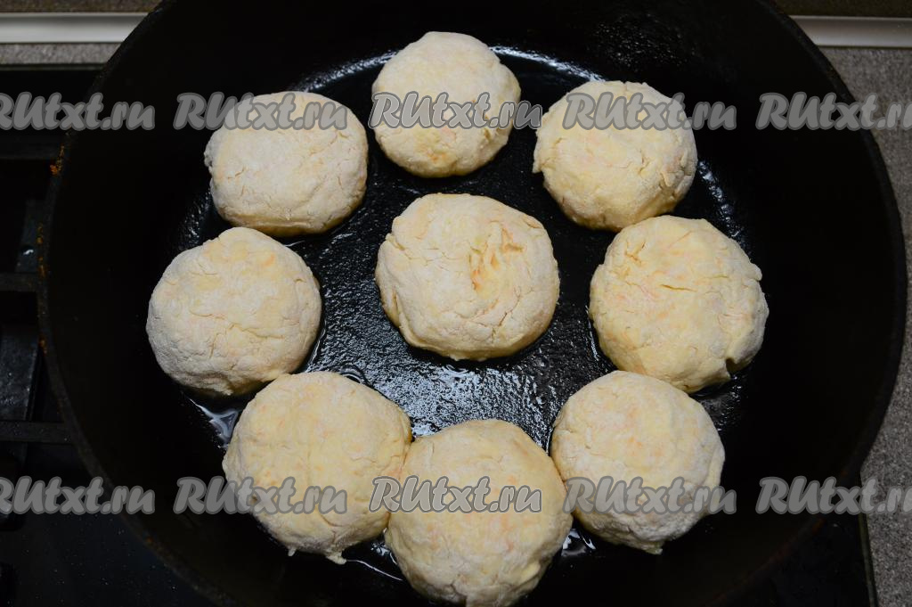 Хорошо разогреть в сковороде растительное масло, затем выложить сырники, жарить их на среднем огне примерно 3-4 минуты (до образования румяной корочки снизу).