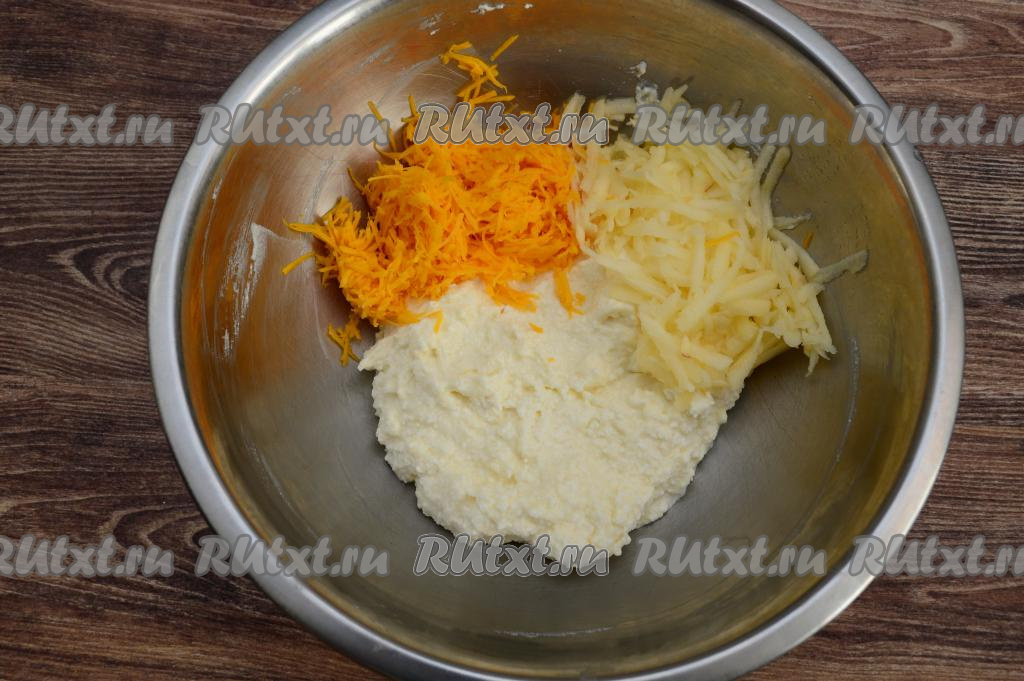 60 грамм тыквы, очищенной от мякоти с семечками и от кожуры, натереть на мелкой тёрке. Яблоко очистить от кожуры и натереть на крупной тёрке, не затрагивая косточки и семенную коробку. Вес натёртого яблока получился 80 грамм. Выложить в миску к творожной массе натёртые яблоко и тыкву.