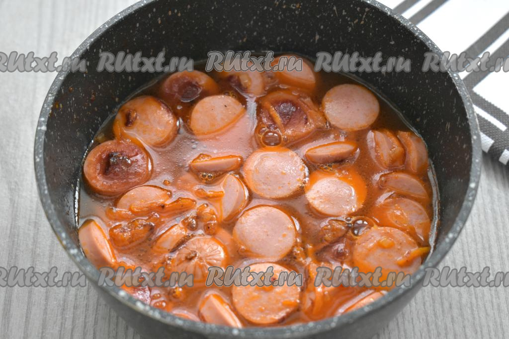 Затем вливаем 150 миллилитров тёплой воды, даём закипеть, накрываем крышкой, убавляем огонь до минимума и тушим гуляш из сосисок в томатной подливке 15 минут. Пробуем на вкус, если нужно, досаливаем.
