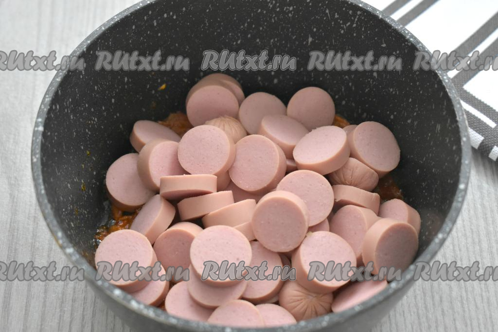 Сосиски (я взяла "Молочные сосиски") очищаем от оболочки, нарезаем на кружочки толщиной примерно 0,5-0,7 сантиметра, добавляем к овощам, покрытым томатной пастой, перемешиваем, обжариваем 5 минут, не забывая периодически перемешивать.