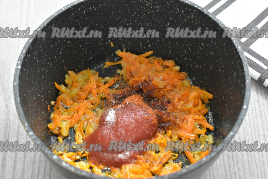 К обжаренным овощам добавляем томатную пасту, немного солим, всыпаем специи (я добавила паприку и чёрный молотый перец), перемешиваем и обжариваем 1 минуту, иногда помешивая.