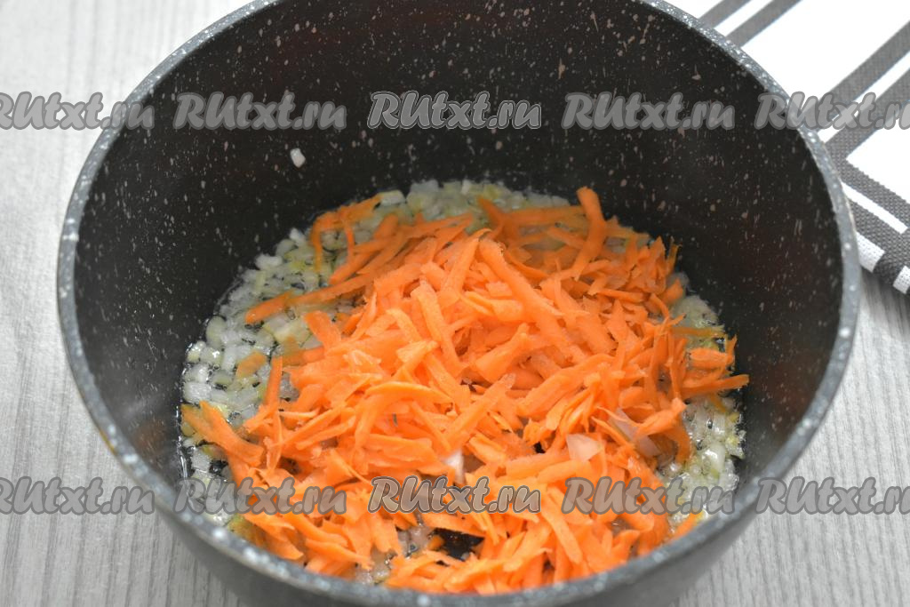 К обжаренному луку выкладываем натёртую на крупной тёрке морковку, перемешиваем овощи и обжариваем до мягкости моркови (4-5 минут), периодически перемешивая.