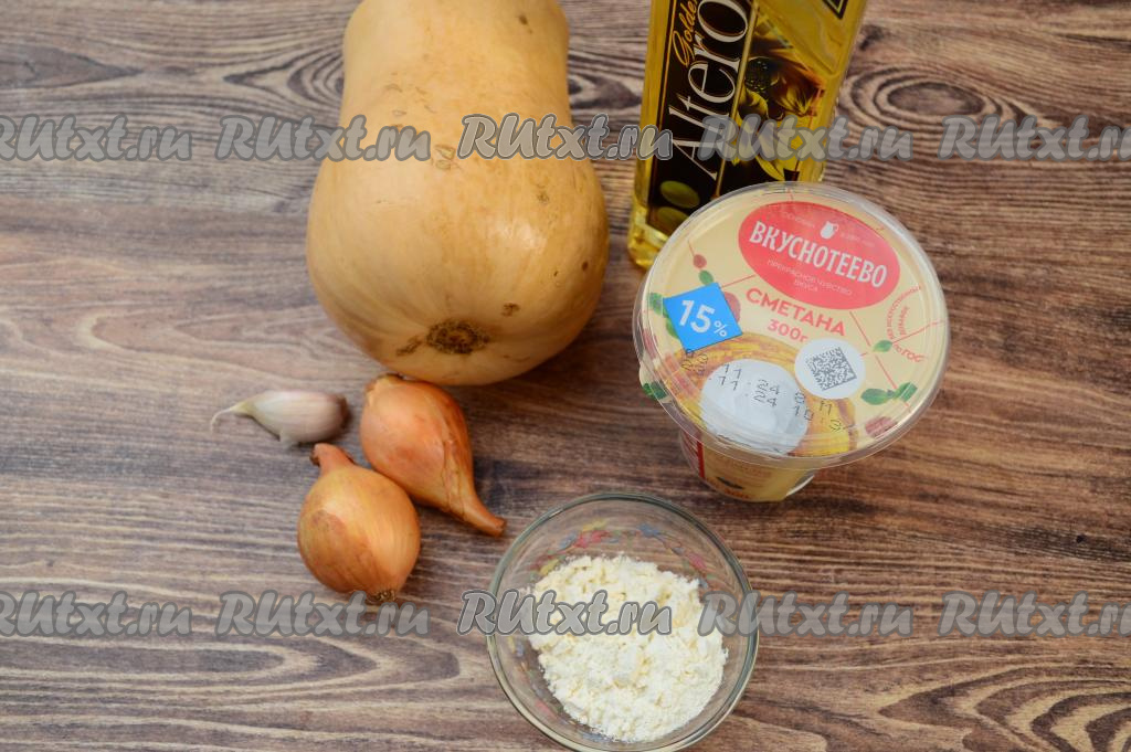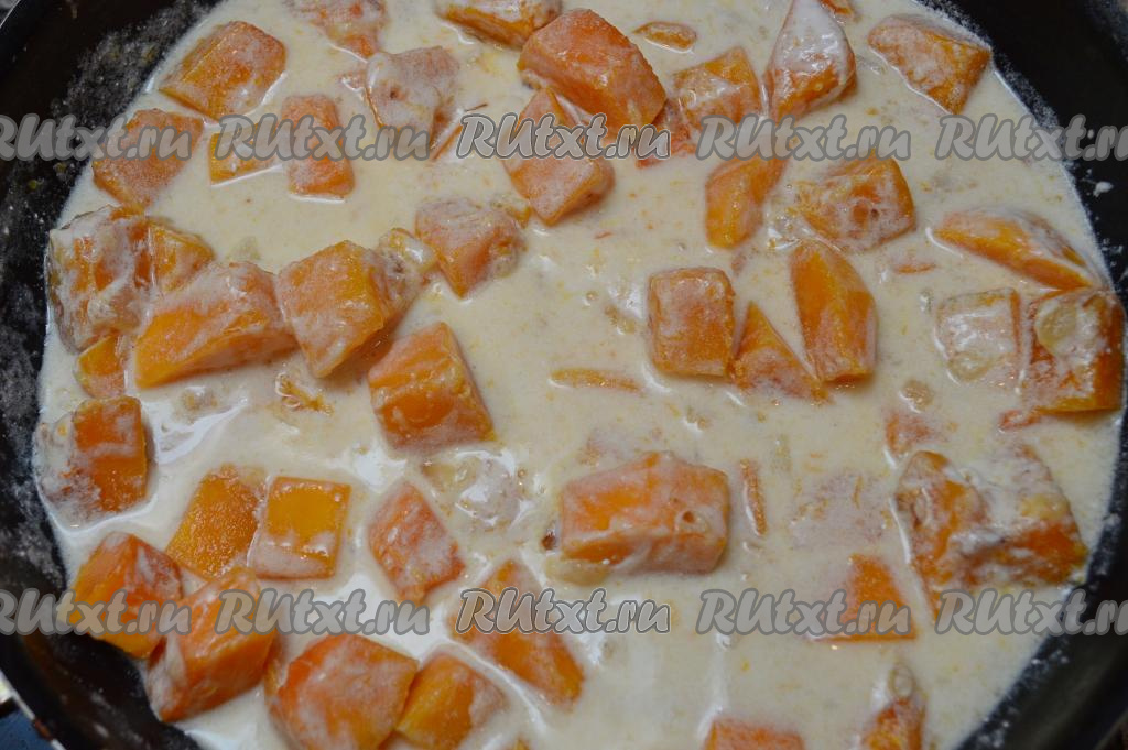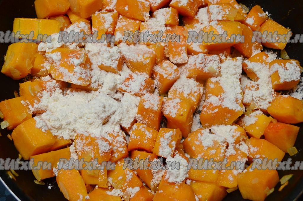 К тыкве, обжарившейся в течение 10 минут, всыпать муку и соль, перемешать, обжаривать 1 минуту. Именно благодаря муке, готовый сметанный соус приобретёт нежную, бархатистую консистенцию.