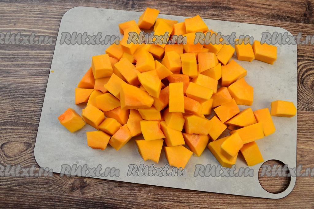 800 грамм тыквы, заранее очищенной от кожуры и мякоти с семечками, нарезать на средние кубики.