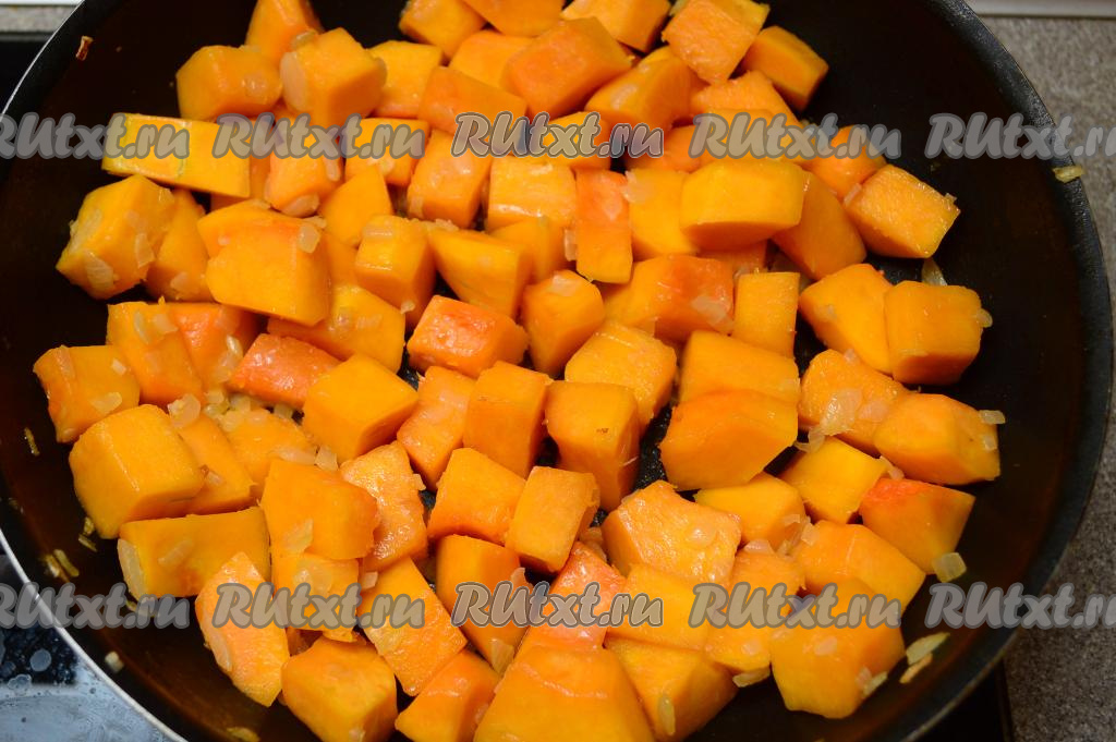 В процессе обжаривания тыква слегка размягчится (у меня она стала помещаться в сковороду в один слой). Благодаря обжариванию, кусочки тыквы в дальнейшем не разварятся и будут держать форму.