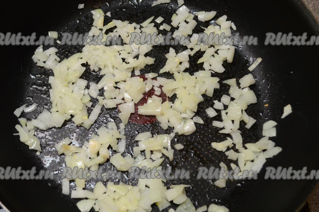 Очистить лук, мелко его нарезать. Разогреть растительное масло в сковороде, после этого выложить нарезанный лук и обжарить его, иногда, помешивая, на среднем огне в течение 3 минут.