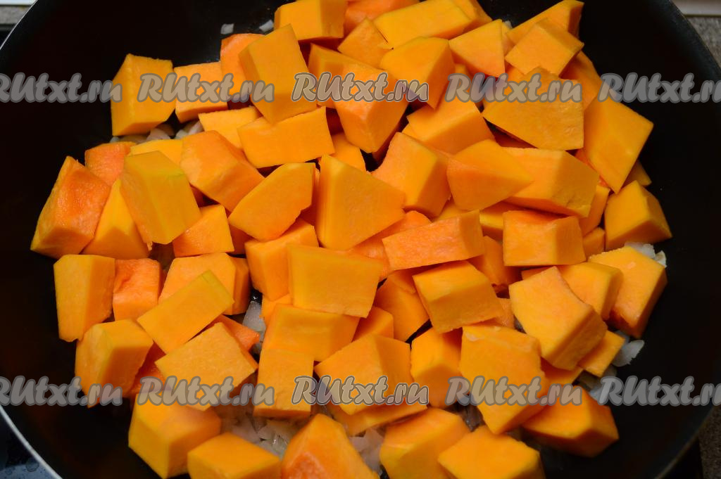 К обжаренному луку добавить кусочки тыквы, перемешать. Обжаривать тыкву, периодически аккуратно перемешивая, в течение 10 минут.