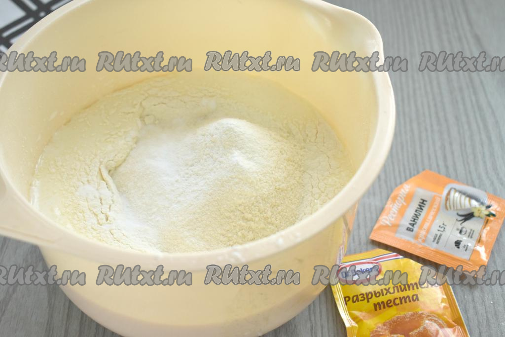 В получившуюся массу просеиваем 100 грамм муки, добавляем разрыхлитель и ванилин, перемешиваем тесто лопаткой до однородности.