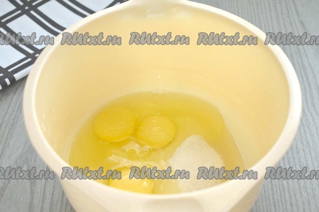 В глубокую миску всыпаем сахар, вбиваем яйца.
