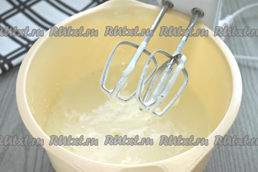 Взбиваем сахар с яйцами на максимальных оборотах в течение 4-5 минут, в результате должна получиться пышная, светлая яичная масса.