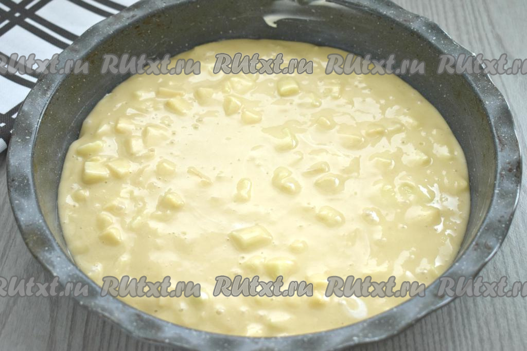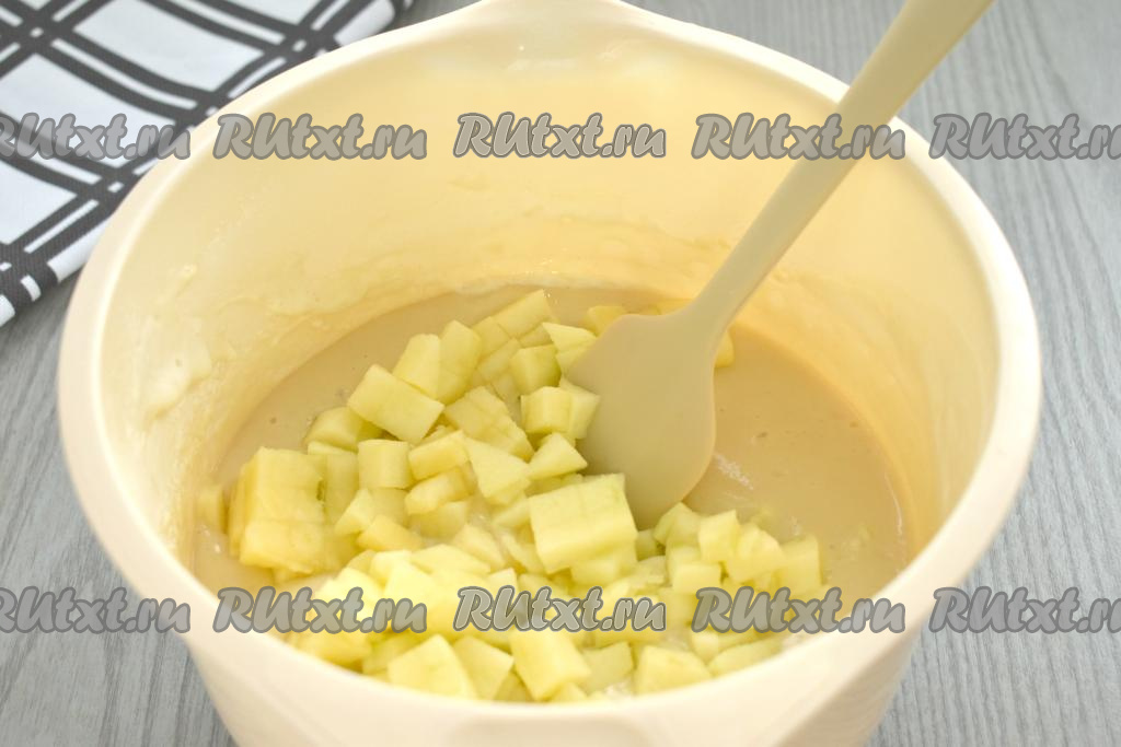 Яблоки очищаем от кожуры, удаляем сердцевину с семечками, нарезаем на небольшие кубики и выкладываем в замешанное тесто для шарлотки, перемешиваем.