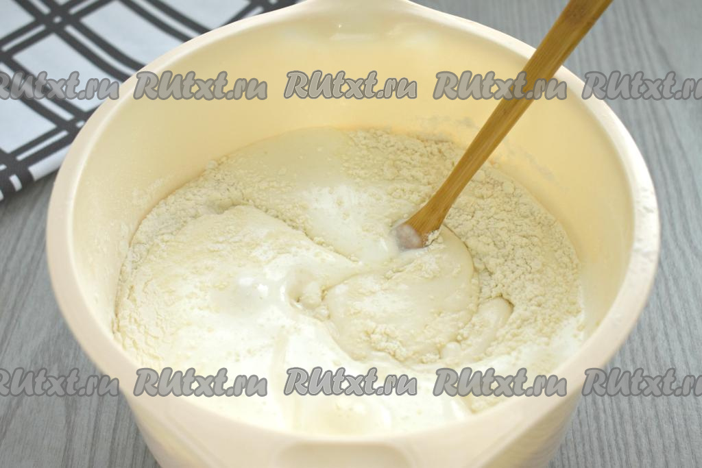 Затем в получившееся тесто вливаем смесь ряженки и соды, снова перемешиваем до однородности лопаткой. Частями всыпая оставшуюся просеянную муку и хорошо вмешивая её, замешиваем в меру густое, однородное тесто, напоминающее сметану средней жирности.