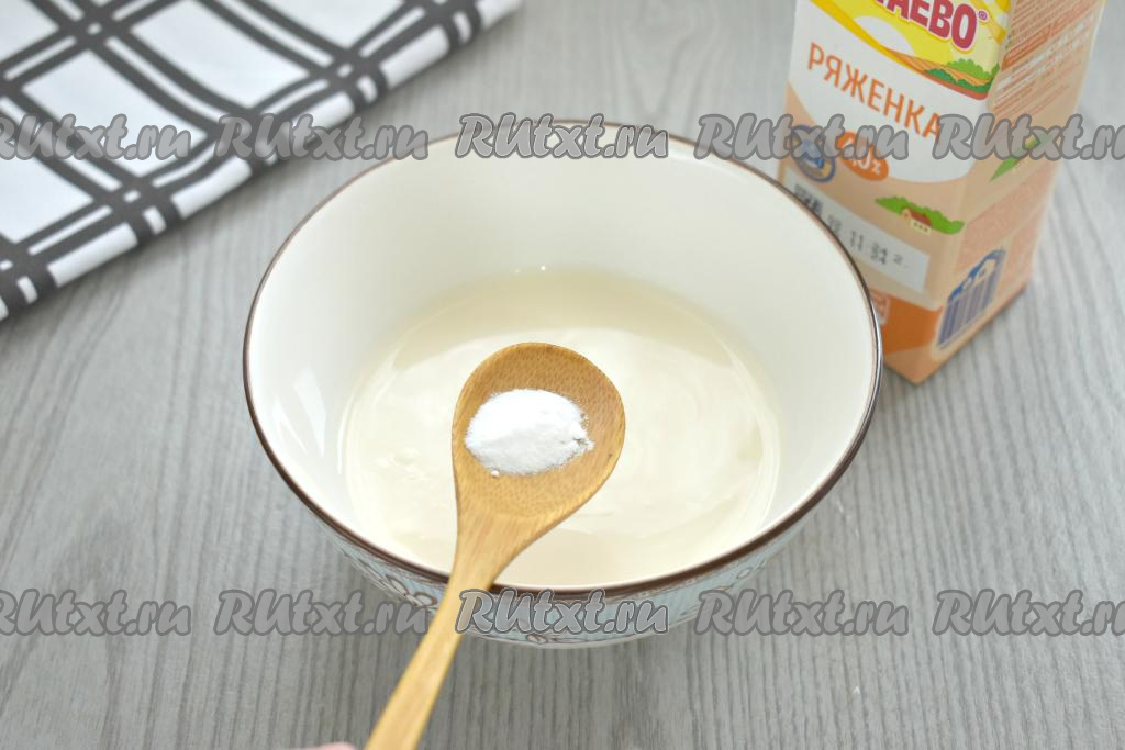 Ряженку можно взять любой жирности, я купила жирностью 4%. Ряженка для замешивания теста должна быть комнатной температуры, поэтому её нужно либо заранее достать из холодильника, либо можно подогреть в течение 10-15 секунд в микроволновке. Переливаем ряженку в небольшую миску, добавляем соду, тщательно перемешиваем и оставляем на время, пока будут взбиваться яйца. В течение этого времени сода вступит в реакцию с кислой средой ряженки, и на поверхности появятся пузырьки.
