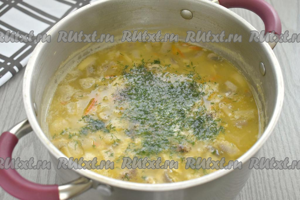 В конце приготовления горохово-грибной суп по вкусу перчим, выкладываем мелко нарезанную зелень, даём закипеть, провариваем 1-2 минуты на небольшом огне. Убираем кастрюлю с огня.