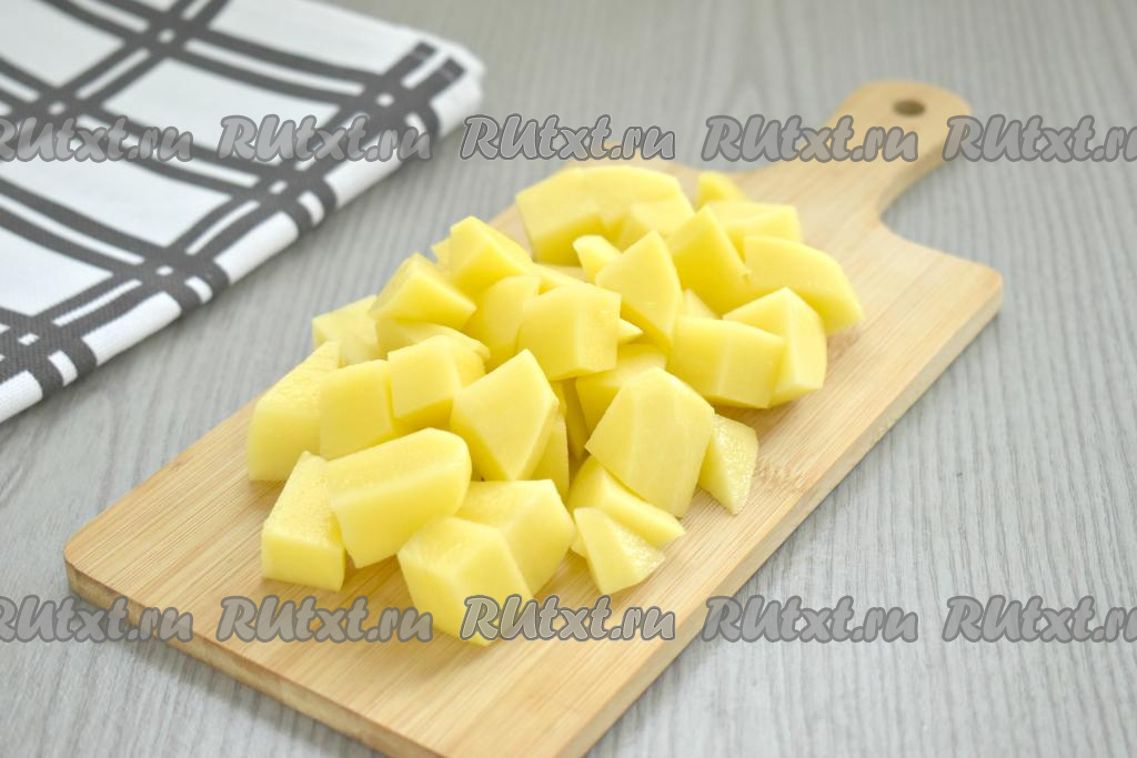 Когда горох станет достаточно мягким, выкладываем в кастрюлю очищенную картошку, нарезанную на средние кубики, даём бульону закипеть и варим гороховый суп на курином бульоне на небольшом огне 15 минут.