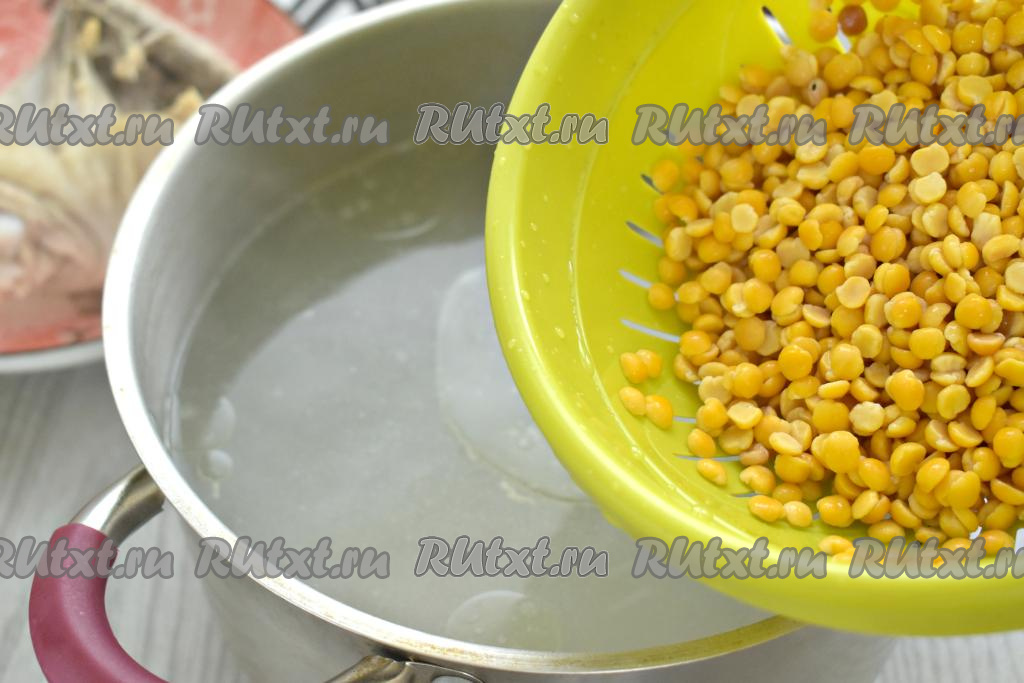 Как только поставили кастрюлю на огонь, кладём колотый горох в глубокую тарелку, заливаем полностью холодной водой и оставляем на время варки курицы. Если вы будете готовить суп не с колотым, а с целым горохом, тогда желательно замочить его в холодной воде, как минимум, на 2-3 часа (а лучше всего замачивать такой горох с вечера).