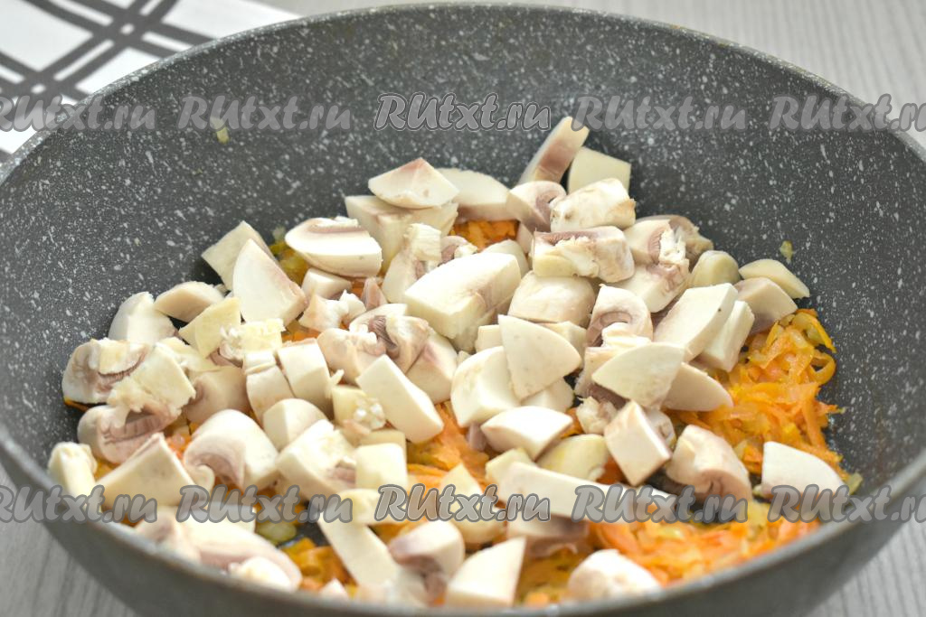Шампиньоны промываем водой, нарезаем их на небольшие кусочки и перекладываем в сковороду с обжаренными морковкой и луком, перемешиваем. Обжариваем грибы с овощами, время от времени помешивая, 10 минут и убираем с огня.